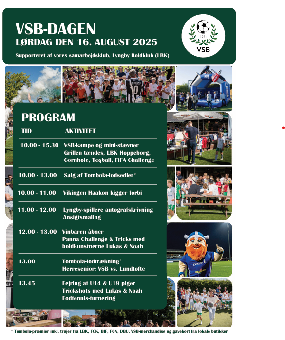 Så er programmet for VSB-DAGEN på plads, og der venter en sjov dag med et hav af forskellige aktiviteter lørdag den 16. august ved Pokalhytten på Kaplevej.